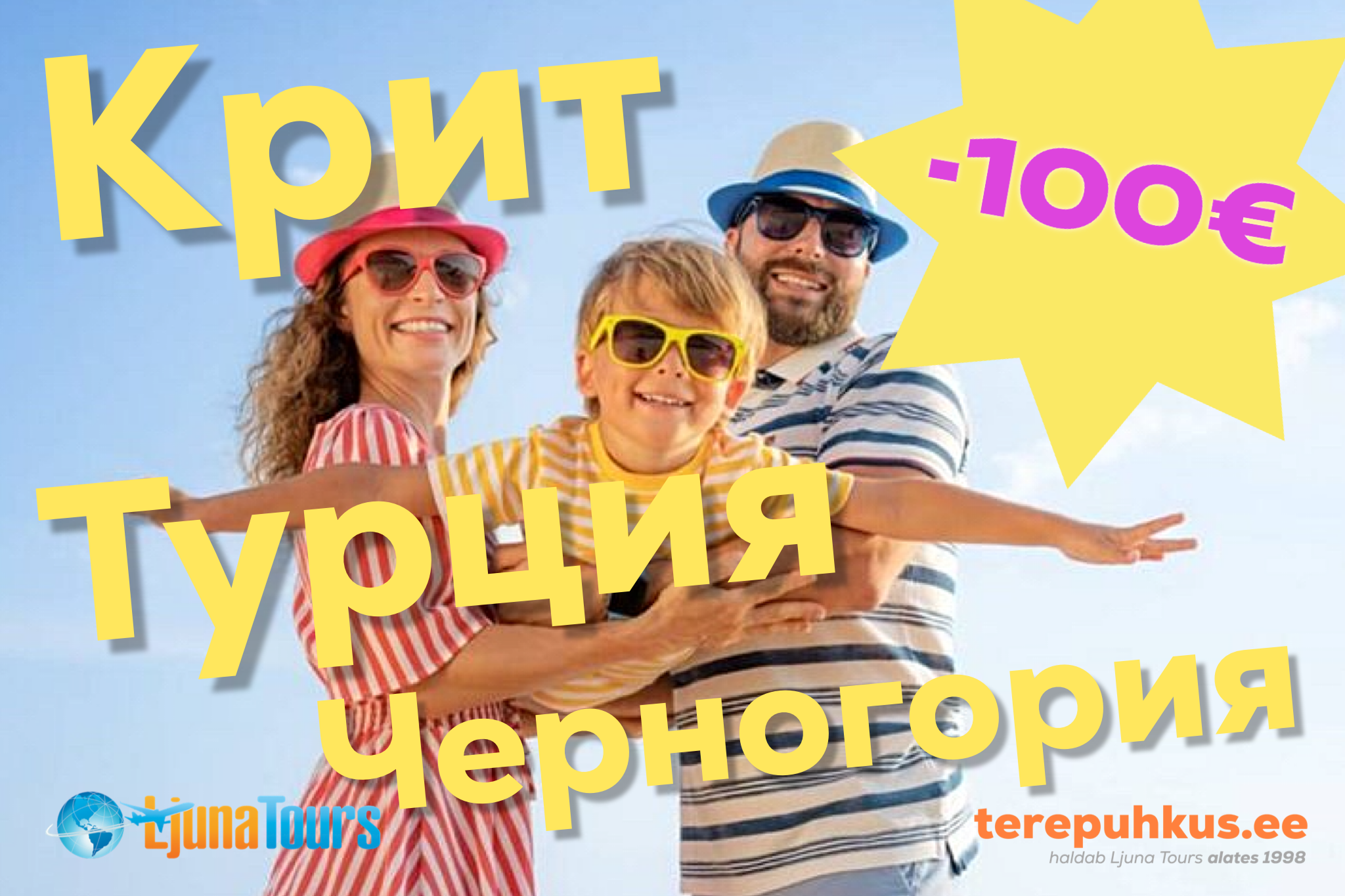 ЛЕТО 2026 - КРИТ, ЧЕРНОГОРИЯ! ПРОДАЖА ОТКРЫТА! При бронировании тура до 02.10.2025 в подарок ваучер на 100 €, бесплатный выбор мест в самолёте, Fast Track контроль в аэропорту Таллинна бесплатно |