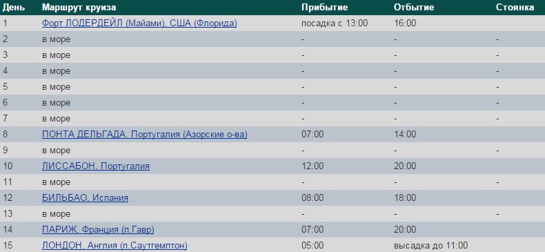 В стоимость входит: Размещение в каюте выбранной категории Круглосуточное питание на борту(кроме спиртных напитков) чай,кофе,соки на завтрак Развлекательные программы на борту Программы для детей и детский клуб Музыкальные представления - шоу, живая музыка, дискотеки, театр Пользование бассейнами, тренажерным залом, сауной, джакузи,мини-гольф Портовые сборы