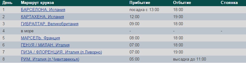 Размещение в каюте выбранной категории Круглосуточное питание на борту Развлекательные программы на борту Программы для детей и детский клуб Музыкальные представления - шоу, живая музыка, дискотеки, театр Пользование бассейнами, тренажерным залом, сауной, джакузи Портовые сборы Дополнительно оплачиваются: Таксы, чаевые, страховка (при её отсутствии), отели (по желанию).